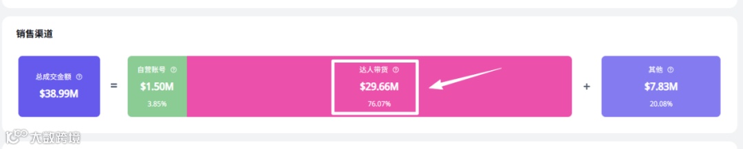 Fanttik 的 TikTok 策略有两个关键词:中腰部达人 + 可复制内容。数据显示,达人带货占店铺销售 76.07%,自营仅占 3.85%,视频成交占比高达 79.9%。