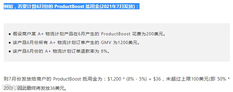 抵用金的计算公式为:ProductBoost抵用金=月度“A+物流计划”GMV*(月度“A+物流计划”订单退款率-5%),最多不超过月度ProductBoost花费的50%。