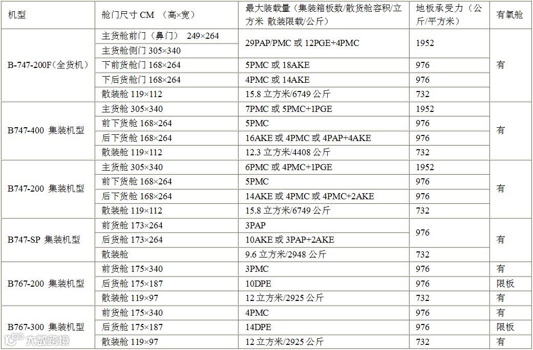 货舱总容积(M3):B747-200、170 M3;B747-300、175M3;B747-400、120