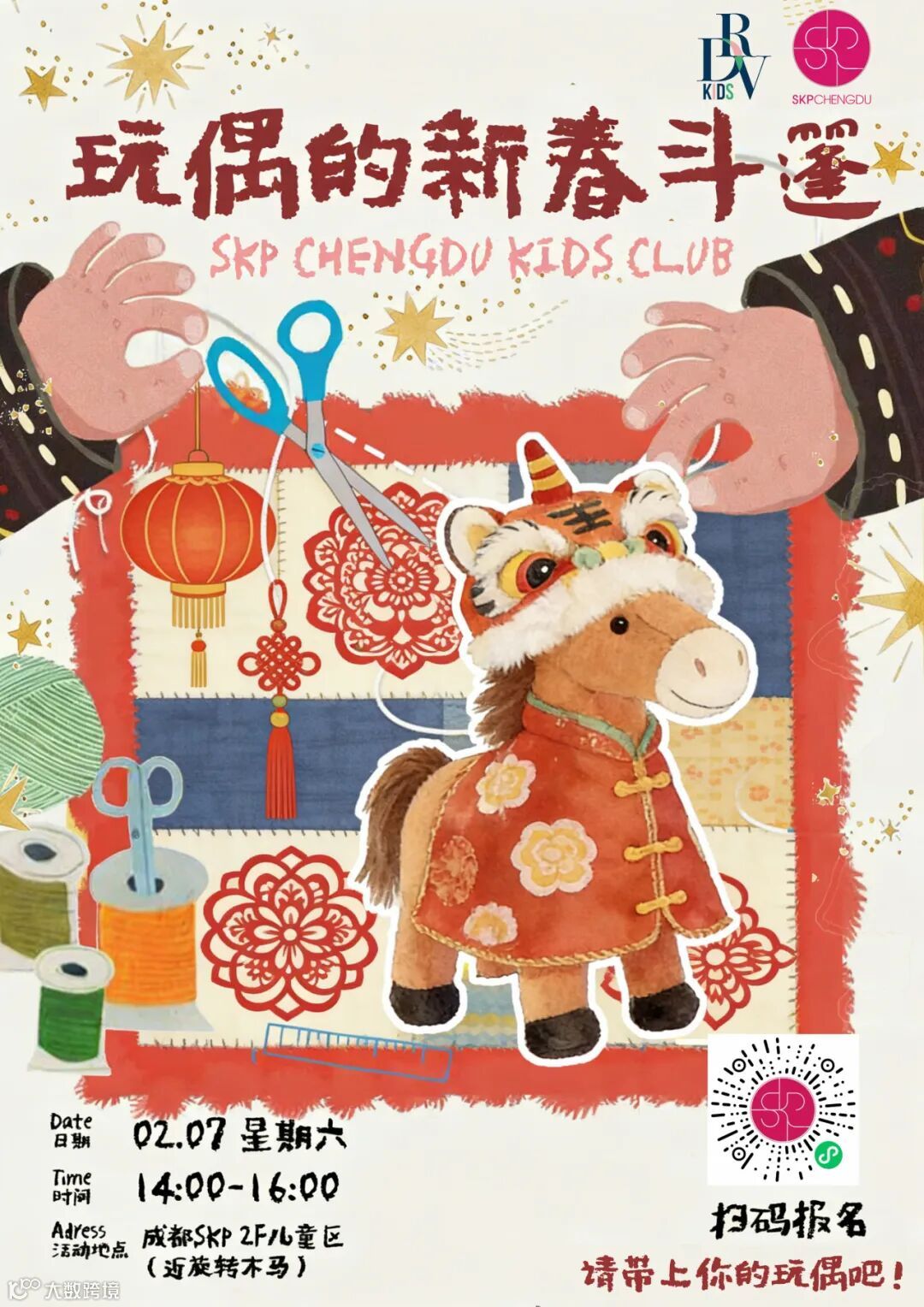 2026年2月7日(周六)14:00-16:00,成都SKP 邀请小朋友们跟随老师们一起制作玩偶的小小斗篷。