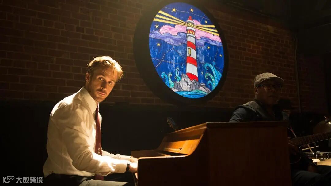 在这段关系里,塞巴斯蒂安反而是率先接受现实的那个人。在遇到米娅之前,他一直固守在自己的世界里,发疯一样执着于爵士乐的种种细节——它的名人轶事,它的历史,还有弹错一个音符的灾难性,却不肯直面这种艺术已经日薄西山。谈及自己梦想中的爵士乐俱乐部时,他强调它必须要叫什么、一定要在哪里,对这些外在形式的强调到了可笑的地步。面对昔日好友抛出的橄榄枝,他能够毫不客气地拒绝,因为他不肯向商业妥协,因为他清高。