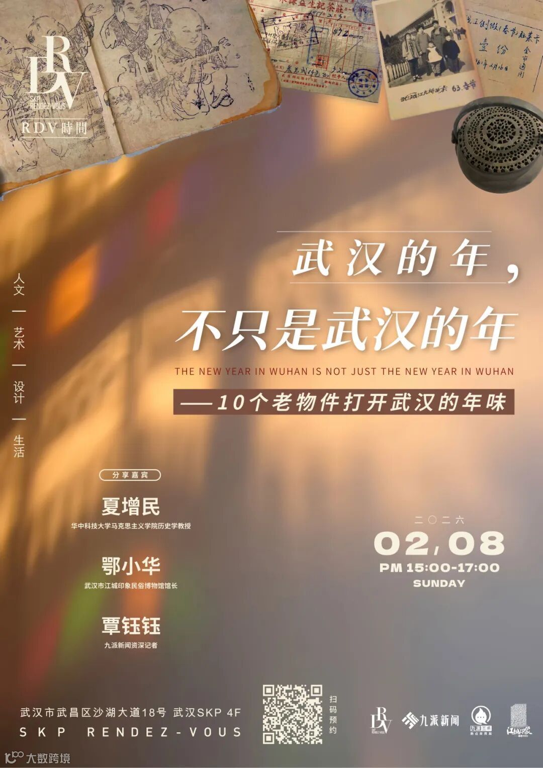 2026年2月8日(周日)15:00-17:00,华中科技大学马克思主义学院历史学教授夏增民、武汉市江城印象民俗博物馆馆长鄂小华、九派新闻《九派圆桌》《九派长谈》主持人覃钰钰一同做客武汉SKP 4F SKP RENDEZ-VOUS。从武汉的10个老物件出发,听老物件开口说话,聊一聊大武汉里的“中国年”。