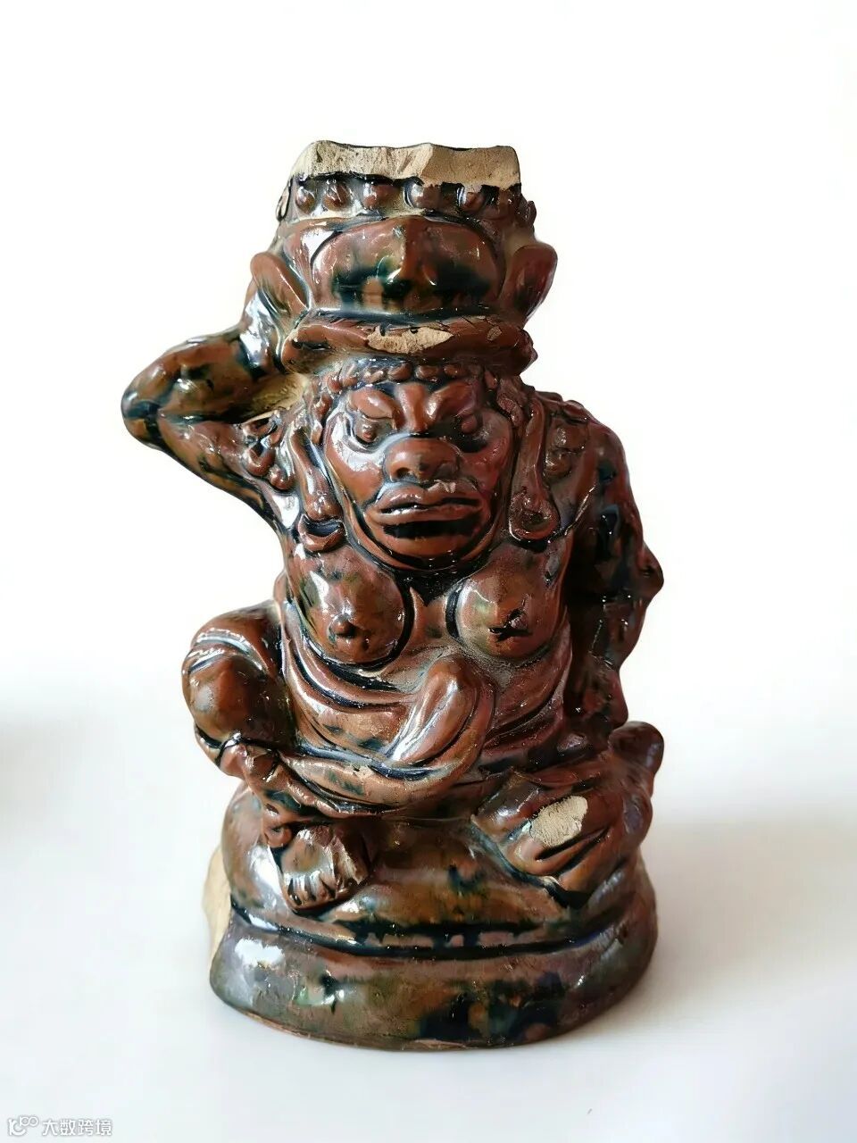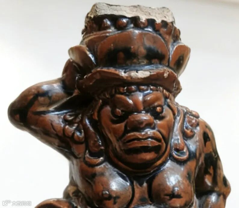 衣纹以粗犷的线条堆叠而成,随身体的扭转自然垂落,褶皱间的起伏与肌肉的轮廓相呼应,兼具装饰性与写实感。器物通体施釉,窑变釉,褐红、黑色与酱色在高温下交融流淌,形成斑斓的美感。