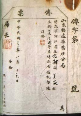 上图为1941年,山东省招远县禁烟分局《传票》,传询事,仰即前往拾肆区吴家村,立将吴进烟等查传到局侯讯勿延