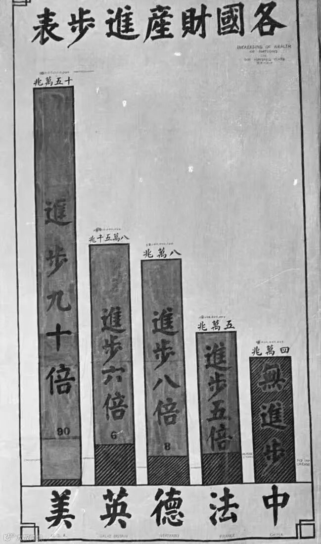 上图为1908年的图片,反映了五个国家“GDP”指标和发展态势,中国“无进步”,美国“进步九十倍”
