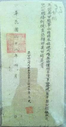 上图为1939年,甘肃省靖远县《甘结保证书》,保证所辖境内无偷种烟苗,如发现1.5亩苗,甘愿依照违犯禁烟条例从重惩办