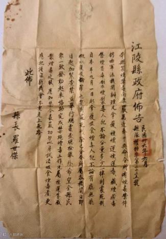 上图为1947年,湖北省江陵县《禁烟禁毒布告》