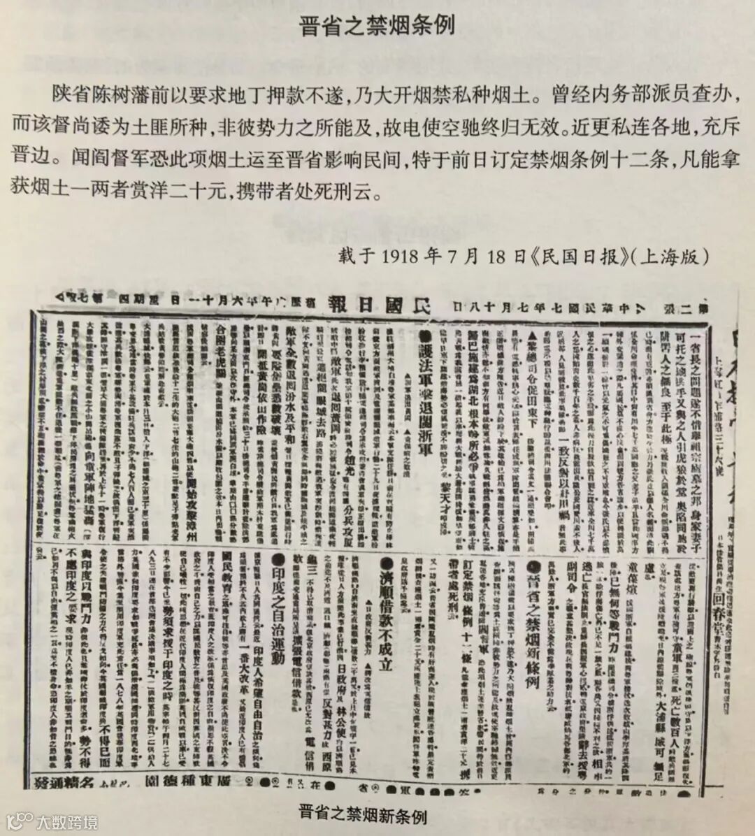 上图为1918年7月18日《民国日报》登载的《晋省之禁烟条例》
