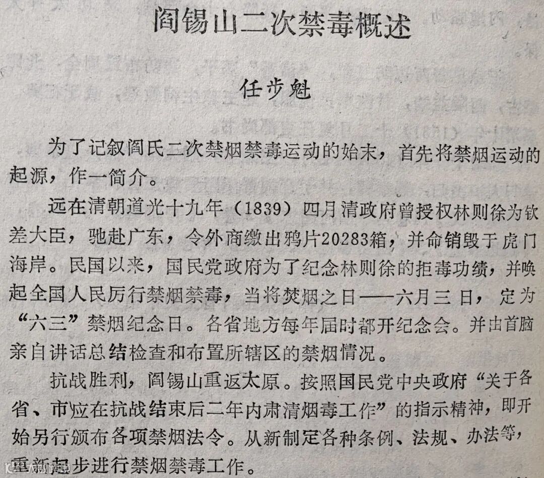 上图为1994年8月,太原市民建委员任步魁撰《阎锡山二次禁毒概述》,刊于《太原文史资料第20辑》