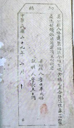 上图为1940年《切结(保证书)》,具切结人(严)格遵(守)禁烟法令,确(实)不吸食鸦片及各种烈性毒品,如有虚伪,甘愿依法治罪,须至切结者。具切结人:警士毕成福,证明人:警长王士润