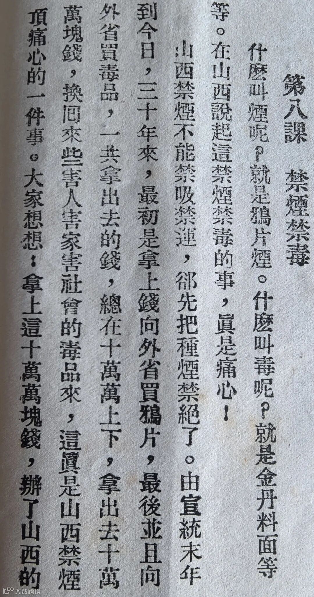 上图为1936年10月,太原绥靖公署编印的《人民政治训练课本》中禁烟禁毒课文