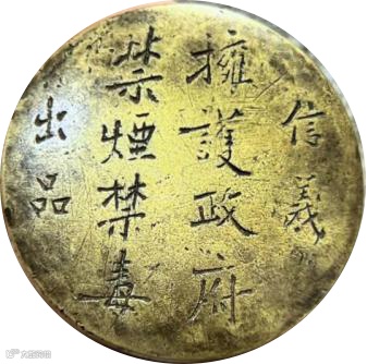 上图为民国时期,湖南益阳县信义中学的铜墨盒,上刻“拥护政府,禁烟禁毒”