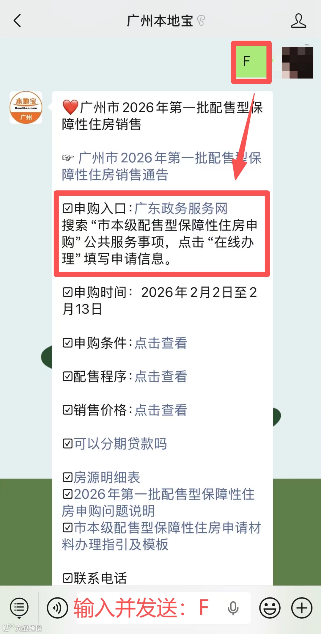 或者长按识别下方二维码,关注【广州本地宝】,点击“私信”,切换到输入对话框,首页对话框输入并发送【F】,即可获申购入口等。