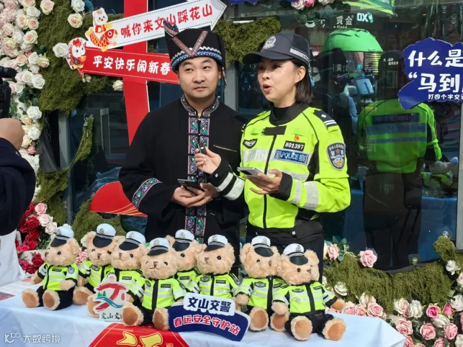 2月12日上午,文山州公安局交通管理支队携手文山州文化和旅游局开展的“平安春运・畅游文山”主题直播活动暖心“开炸”!活动在文山交警、云南交警、云南发布、云南网、云南日报多个官方抖音账号同步直播。线上线下交警小熊、文旅新春礼包、福字套装、定制头盔等好礼接连送出,氛围感直接拉满,超6万人参与了直播互动!