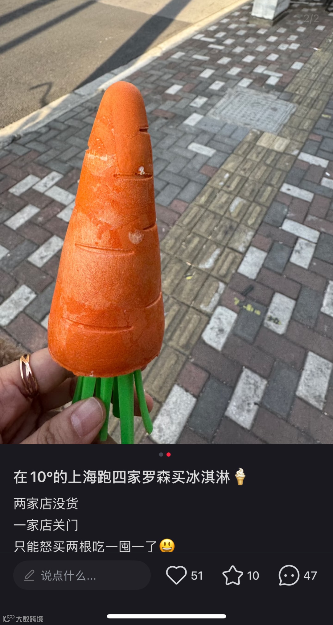 年轻一代的消费者,早已不满足于买东西,更在意买东西的过程。他们愿意为有趣的产品故事、独特的消费体验付费,而一根造型奇特的胡萝卜雪糕,就可能成为他们选择走进这家店,而非那家店的理由。