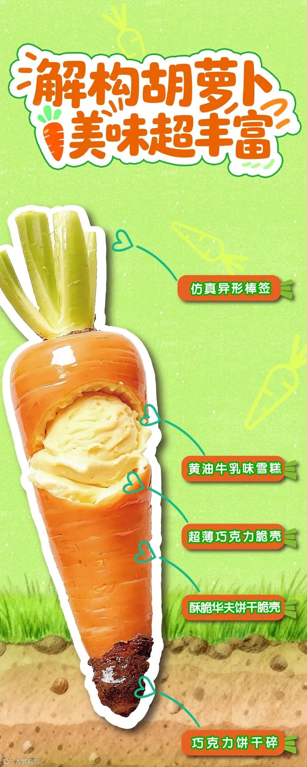 从颜色到纹理,从泥土斑点到叶子形状的雪糕棒,每个细节都充满话题性。薄脆的华夫饼干脆壳和巧克力外壳里是绵密的黄油牛乳内馅,浓郁的奶香裹挟着淡淡的黄油香气,甜度把控得恰到好处,没有甜腻感,反而透着一丝清爽,还掺杂了巧克力饼干碎来模仿胡萝卜尾部自带的泥土。