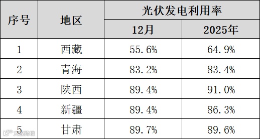 12月,西藏光伏发电利用率最低,仅55.6%,其次是青海,利用率83.2%,利用率最低的五个省份如下: