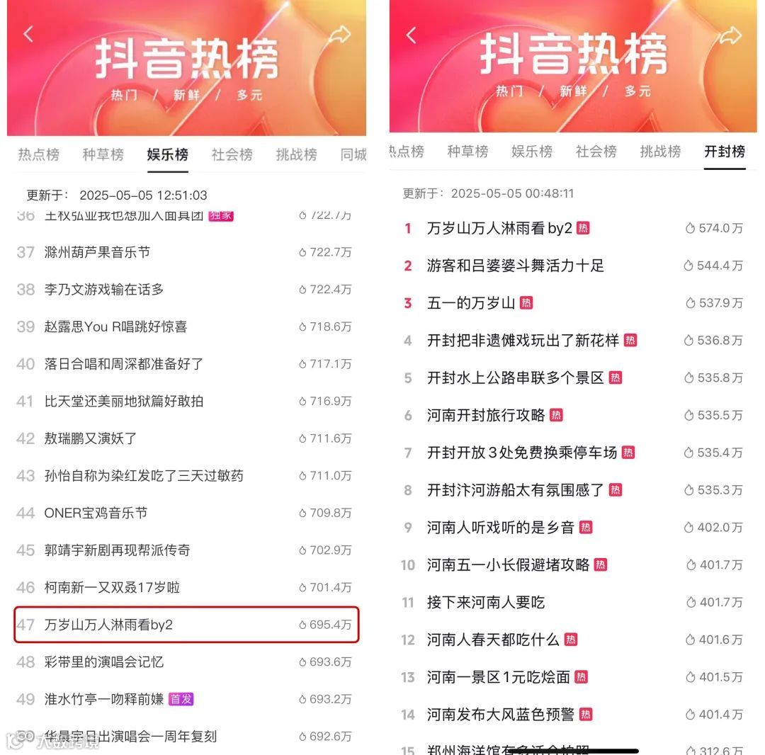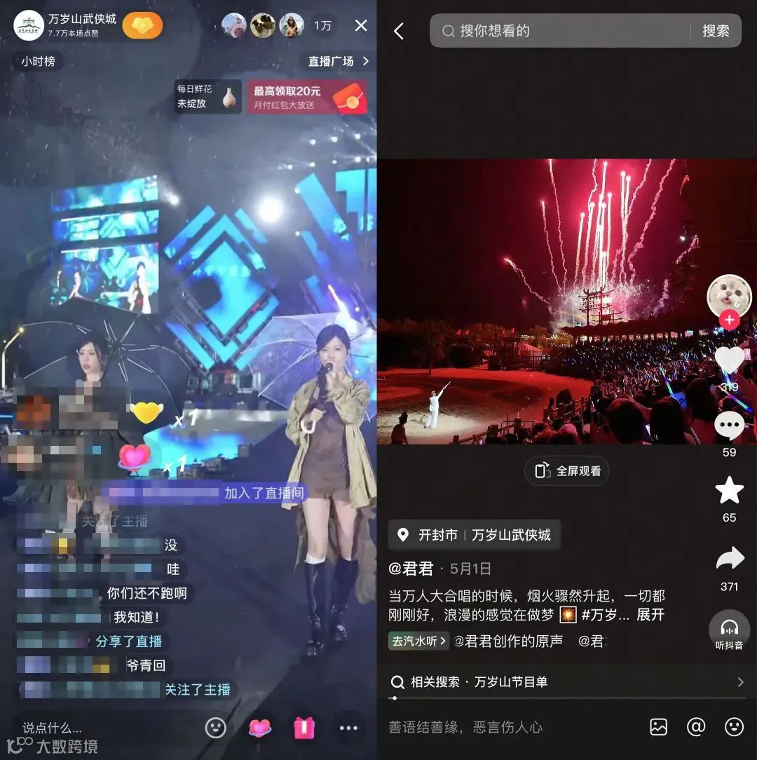 正式进入小长假之后,用户浏览时长增加,但注意力分散,内容覆盖的时长和范围至关重要。于是,万岁山节奏拉满,通过长时间直播+短视频铺量+话题词加热,官方账号实时输出现场盛况、互动内容及高光片段,引爆关注,为景区持续引流。