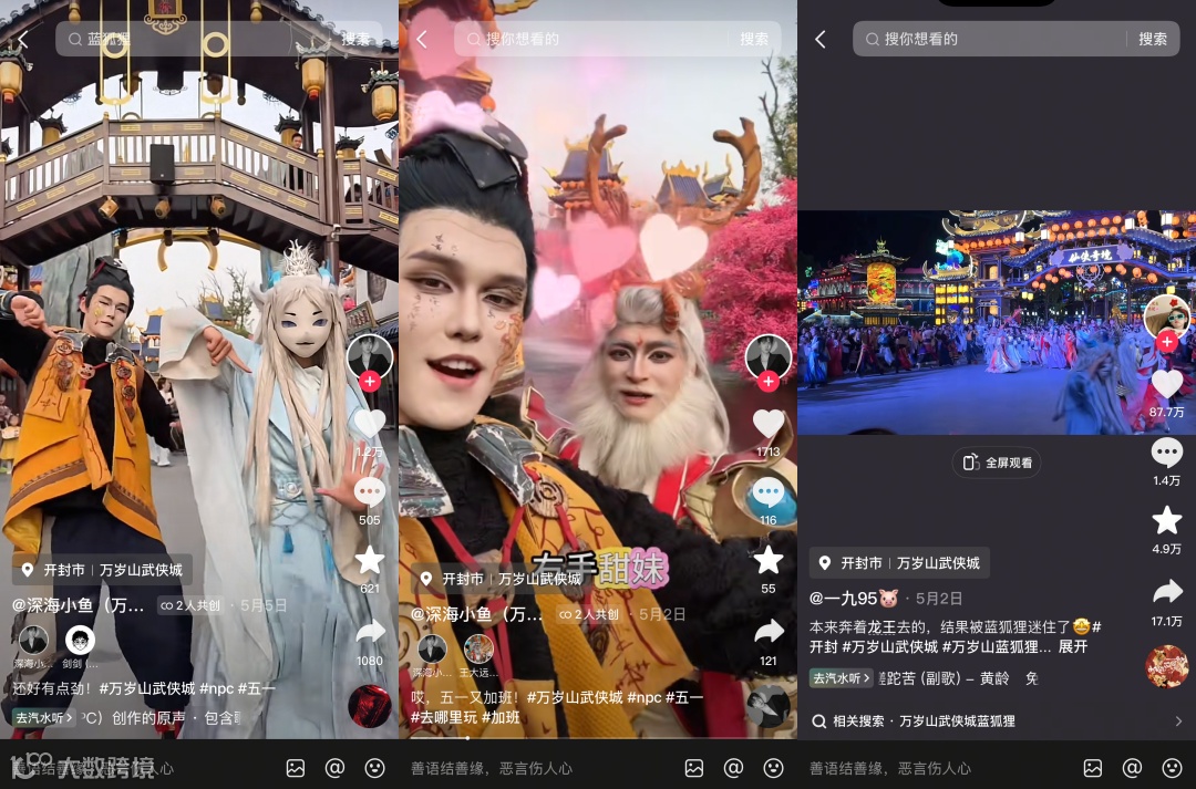 因此,早在五一活动开始之前,万岁山就在全域范围内进行惊喜预告,有针对性地提升了内容的吸引力,一方面有意识地围绕“沉浸式武侠乐园”定位,发布武侠打斗名场景、剧情高能点、“王婆说媒”大彪方言、“蓝狐狸”女团舞等高视觉化内容,作为吸引眼球的钩子;另一方面,也鼓励园区演员将演出花絮、幕后故事、角色日常上传分享,依靠更有“活人感”的传播内容建立情感,拉近用户距离。