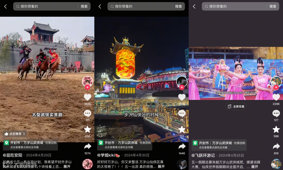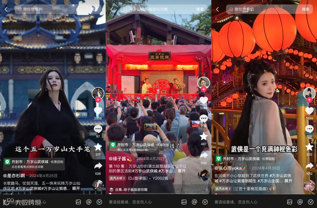 抖音生活服务发布的《五一消费数据报告》显示,河南开封的万岁山武侠城成为“全国最受欢迎景区”之一,在开封本地榜单中霸榜前三。