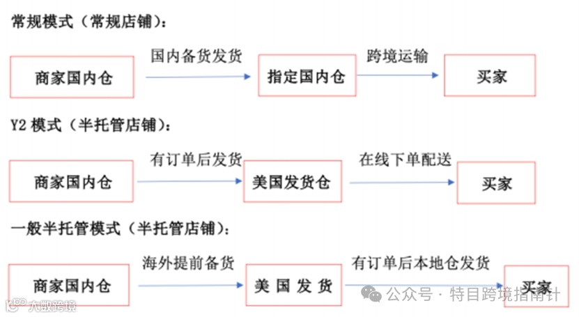 根据美国站点的备货发货情况,对常规模式(常规店铺)、Y2 模式(半托管店铺)、一般半托管模式(半托管店铺)进行对比如下:
