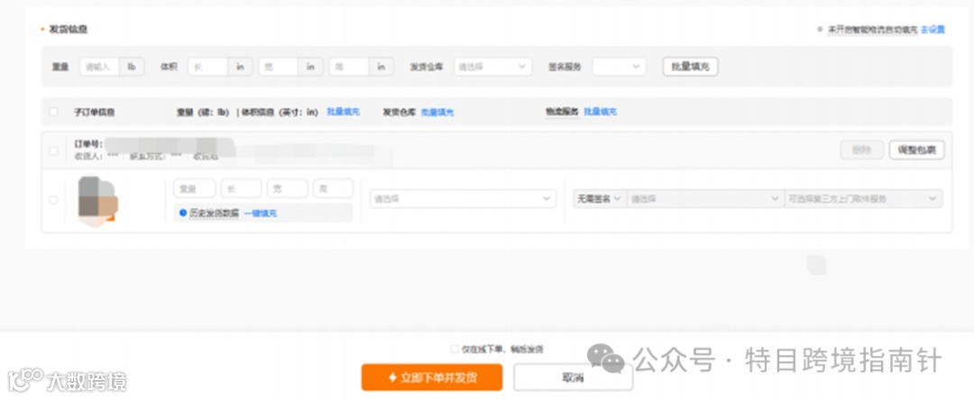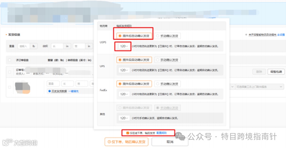3、填写完成后,建议选择【仅在线下单,稍后发货】并配置相应的规则(可考虑配置 揽件后自动确认发货-120小时)。注意慎重选择【立即下单并发货】,因为Y2模式下商品需先从中国发往美国,可能长时间无尾程物流轨迹,如在在线下单完成即确认为已尾程发货的话,有引发虚假发货、买家申请售后的风险。