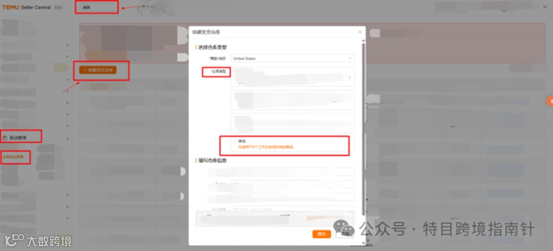 路径:进入 Temu商家中心,在半托管店铺首页点击 SellerCentral,确认授权并前往【美国】,再点击【配送管理】→【仓库地址管理】→【创建发货仓库】,注意 Y2 模式下的美国发货仓在创建时,仓库类型需选择【其他】。