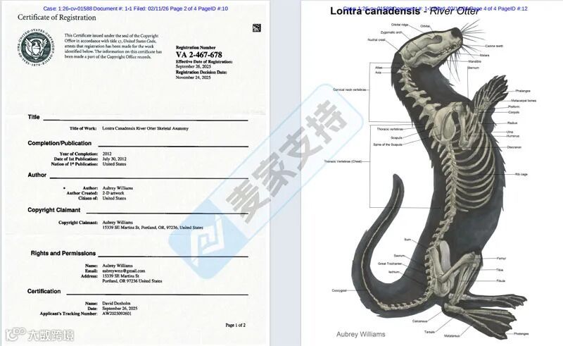 本案是keith律所代理美国概念艺术家Aubrey Williams发起的版权维权案件,涉案作品为其于2025年9月26日在美国获得版权证书的一幅加拿大水獭骨骼解剖图,该作品创作于2012年7月30日,未经授权作为商业使用则会面临TRO冻结风险!本次案件共有65个店铺涉案,目前暂未获批TRO临时限制令,需要名单的卖家可联系我们获取进行自查!扫码进入麦家支持针对keith律所创建的专属群聊,实时掌握keith律所案件最新动态,避免错过案件关键节点!