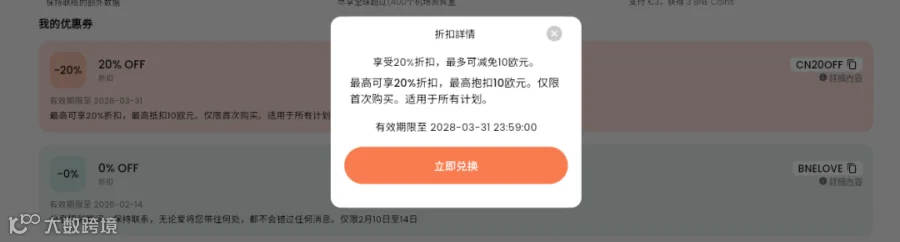 新用户可使用折扣代码 CN20OFF,首次购买享受20%优惠,最高减免10欧元。
