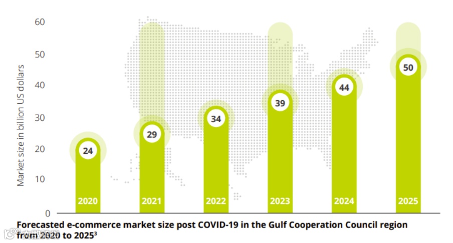 Deloitte数据显示,预计到2025年,中东地区的电子商务市场规模将达到500亿美元,受城市化进程、高消费水平持续增长,中东地区电商市场份额将进一步扩大。