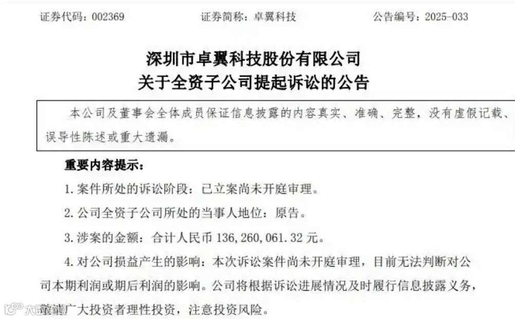 但目前,卓翼科技上述案件尚未开庭审理,也无法判断本次诉讼对公司本期或期后利润的影响。如果罗马仕方面无法履行支付义务,卓翼科技将面临最大1.36亿元的资产减损风险。