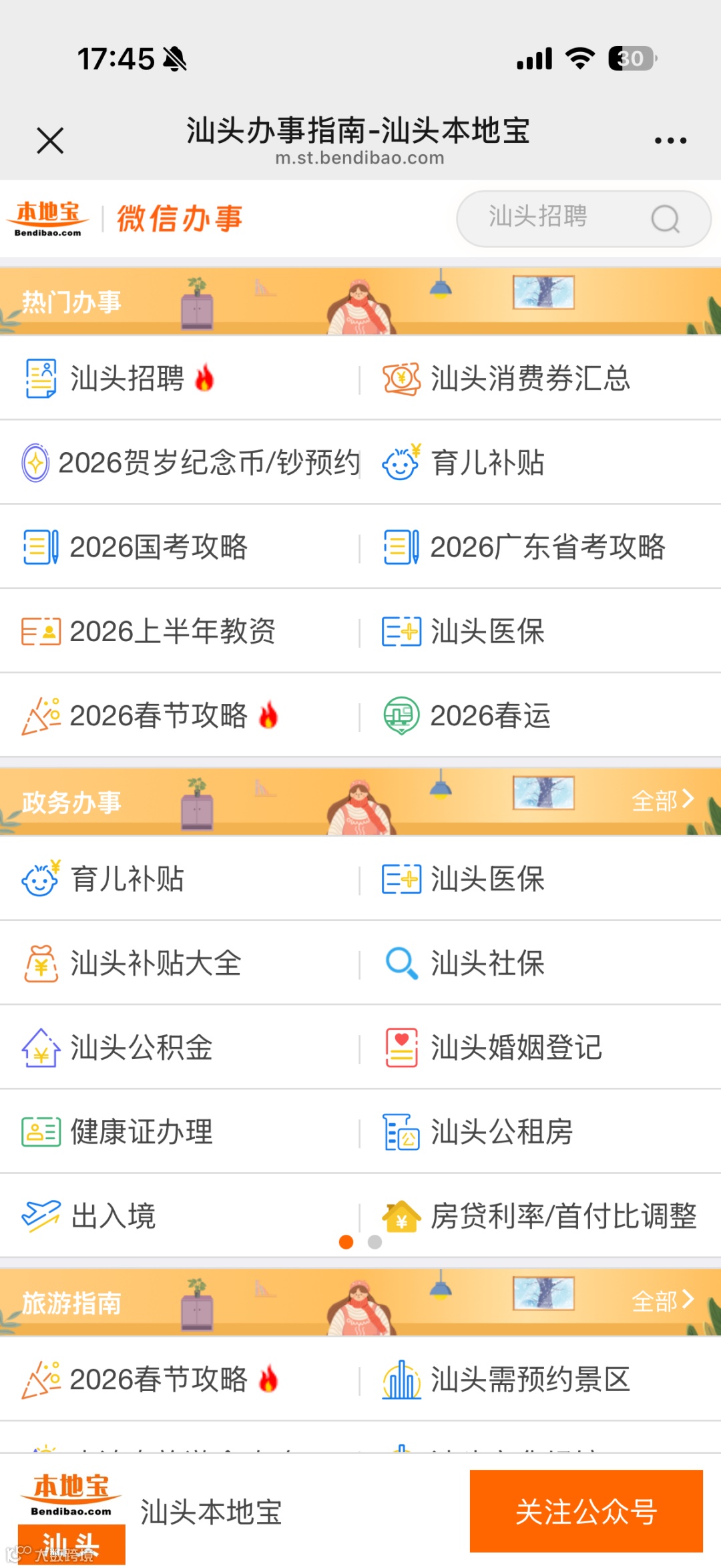小编提醒:长按下方二维码识别并关注公众号【汕头本地宝】,下方菜单栏点击【微信办事】即可获取汕头更多办事指南。