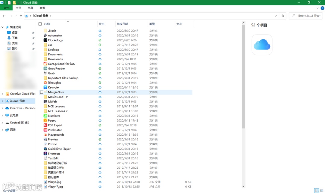作为长期使用苹果生态的用户,iCloud 是连接 iPhone、iPad、Mac 等设备的核心服务,尤其 iCloud 云盘在多设备间同步文件方面表现稳定:无广告、速度快、价格合理。目前我订阅了 200GB 容量,并启用了家庭共享功能,让家人也能高效利用空间进行文件存储与手机备份。然而当加入 Windows PC 后,跨平台文件互通成为痛点。若能像在 macOS 或 iOS 中那样,将 iCloud 云盘直接集成进文件资源管理器,即可大幅提升效率。所幸,Apple 官方推出的 iCloud for Windows 正是为此设计。该软件已上架 Microsoft Store,但需 Windows 10 版本 18362.145(即 1903)及以上方可正常安装使用。登录 Apple ID 并完成设置后,iCloud 会自动开始同步云盘内容,用户可在文件资源管理器中直接访问。系统不仅下载常用文件夹,还会同步由 iOS 或 macOS 应用创建的专属目录,并根据使用频率动态管理本地缓存,实现快速读取。iCloud 云盘根目录示意图