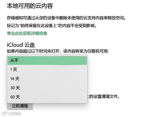 iCloud for Windows 接入 Windows 10 的“存储感知”功能,支持自动清理长时间未使用的本地文件副本,节省磁盘空间。用户可在系统设置中自定义清除周期,范围为 1 至 60 天,机制与 macOS 上的优化存储相似。Windows 存储感知中可管理 iCloud 云盘缓存策略