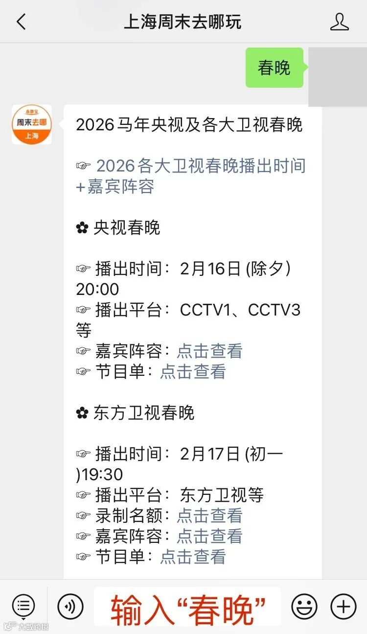 👉 推荐服务:扫描下方二维码,关注【上海周末去哪玩】,后台对话框回复【春晚】查看东方卫视春晚节目信息、直播入口、央视及各大卫视春晚等。(持续更新中)