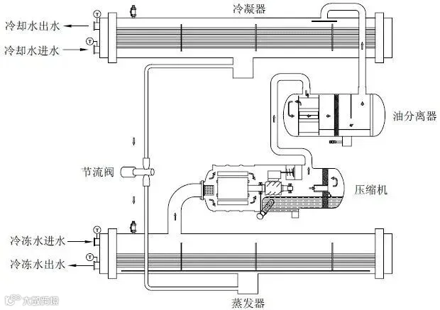 螺杆冷水机组基于蒸气压缩式制冷循环原理运行,其核心流程为:制冷剂在螺杆压缩机中被压缩升温后,进入冷凝器释放热量凝结为高压液体,经节流装置降压降温形成低温低压液体,随后在蒸发器中吸收载冷剂(如水)的热量汽化,从而实现制冷。整个过程通过压缩机、冷凝器、节流阀、蒸发器四大核心部件的协同作用完成制冷循环。