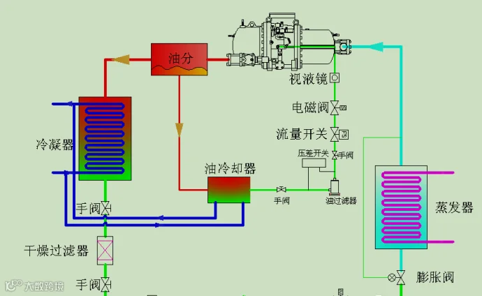 回油系统随制冷剂气体排出的冷冻油顺利回到压缩机,油的循环是由于油分离器和排气压力与注油口之间的压力差所形成的,因为油循环是由压力差产生的,所以油的流量取决于排气与吸气之间的压差。