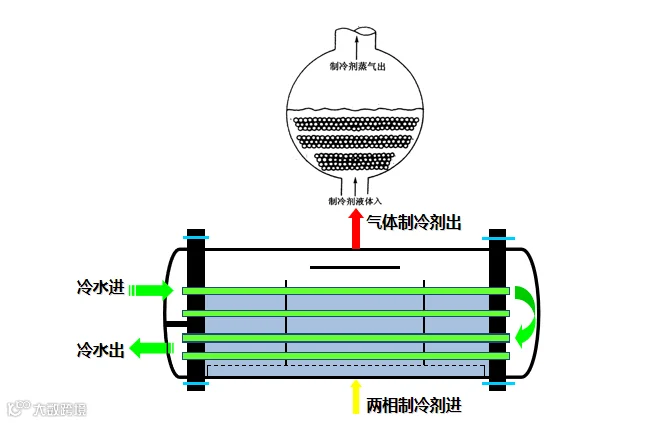制冷剂在壳程(铜管外侧)沸腾吸热,载冷剂(如水)于管程(铜管内部)循环,通过壳管间高效换热实现制冷。该结构传热系数高,但需注意制冷剂充注量控制及润滑油回流问题。