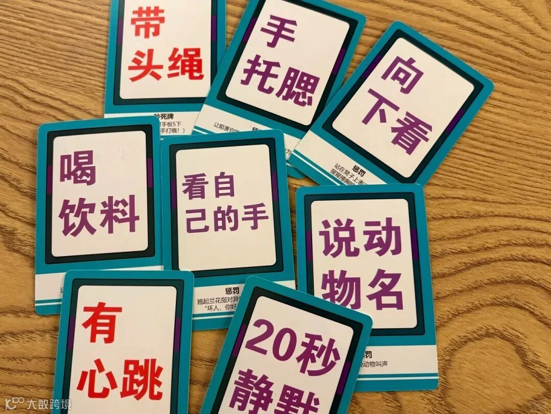 ○ 玩法:每人头上贴一张卡片,写着不能做的事。一旦做了卡片上的事就被淘汰,最后留下的人获胜。
