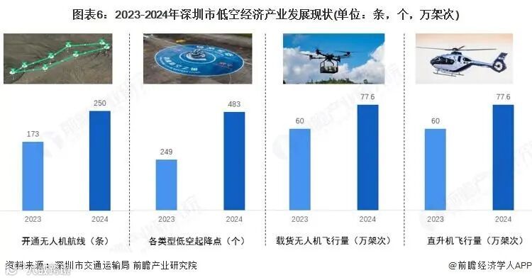 根据深圳市交通运输局发布的数据,2024年,深圳低空经济年产值超过900亿元,实现无人机载货飞行77.6万架次、开通无人机航线250条、直升机载人飞行2.8万架次;建成各类型起降设施483个、建成5G基站8万个,实现120米以下空域5G网络连续覆盖,深圳在低空经济领域飞出的“新高度”。