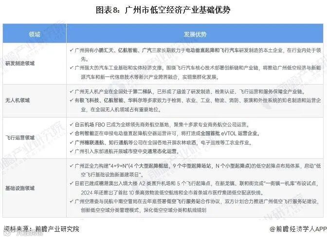 广州低空经济产业在研发制造、无人机、飞行运营和基础设施保障方面均形成一定基础,城市深厚的整车和零部件制造业也易于向低空飞行器生产链转型。
