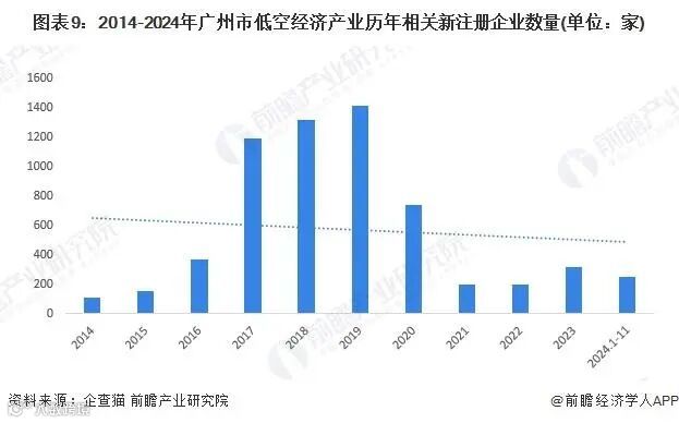 根据企查猫查询数据显示,2014-2024年11月,广州低空经济产业相关的注册企业超6000家。