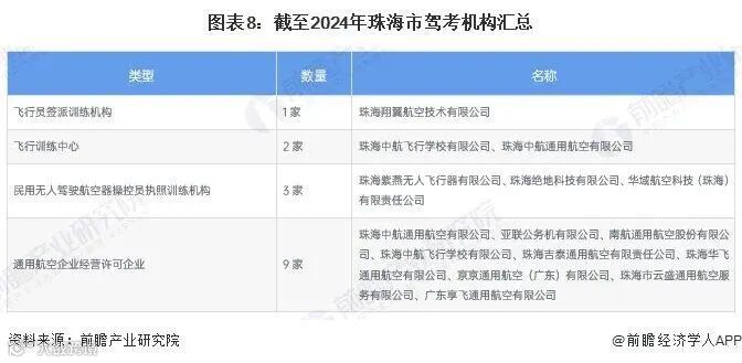 珠海,作为粤港澳大湾区岛屿面积最大的城市,拥有大小海岛262个,被誉为“百岛之城”。同时,珠海还是我国低空空域管理改革试点城市和首批26个国家通航产业综合示范区之一,优越的区位条件以及“双航展”优势,使其在低空经济领域具有良好的产业基础和发展条件。从驾考机构来看,2024年,珠海市拥有飞行员签派训练机构1家、民用无人驾驶航空器操控员执照训练机构3家、通用航空企业经营许可企业9家等。