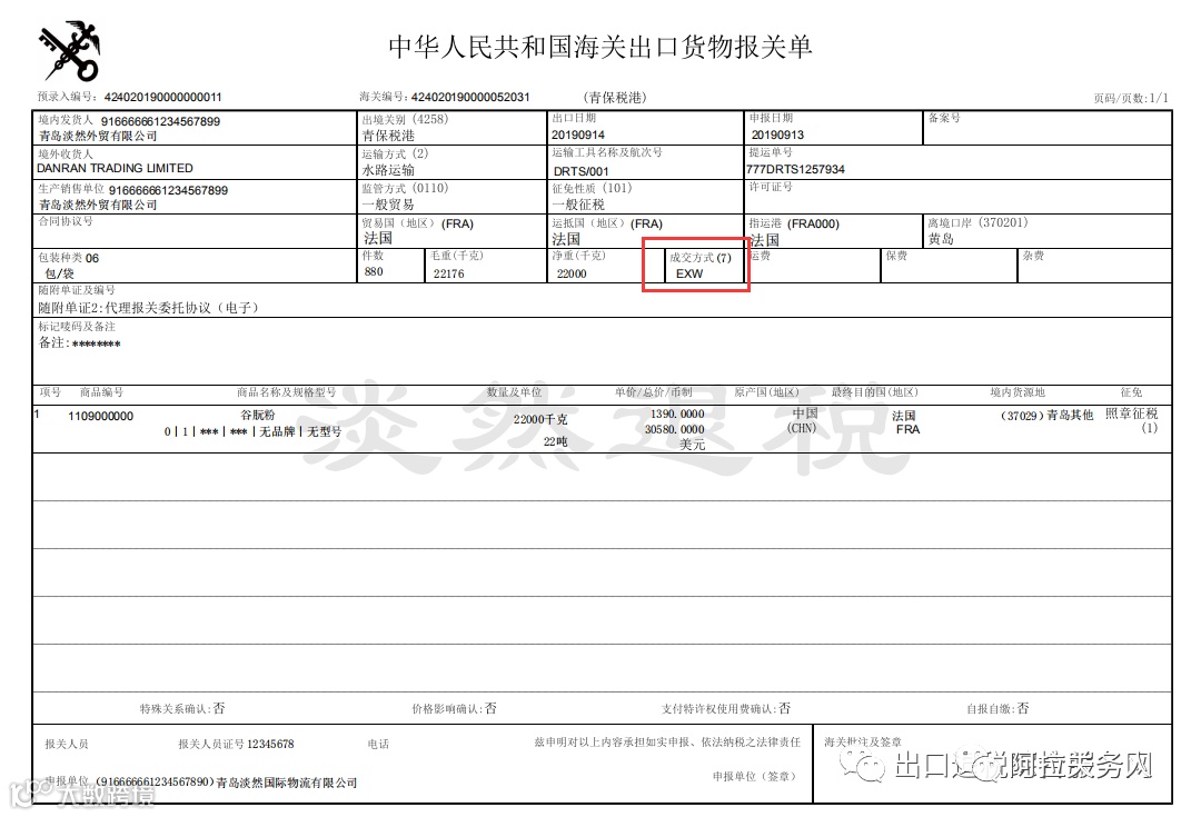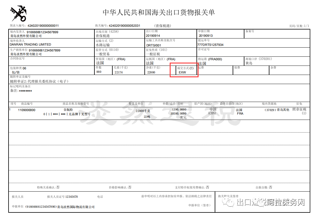 1)报关单填写的成交方式为EXW