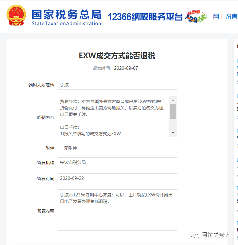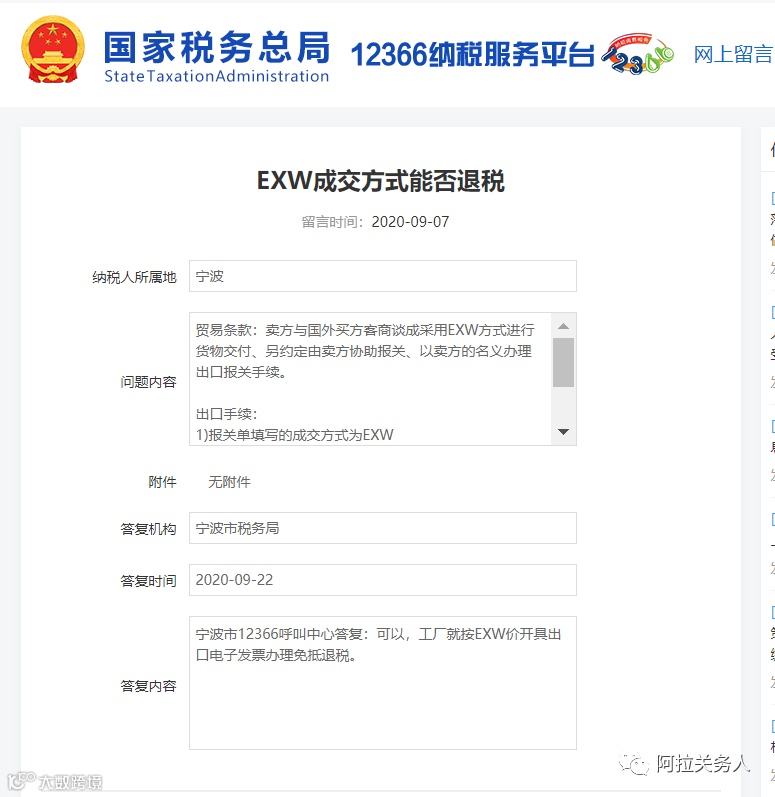 之所以出现有企业询问,就是因为EXW成交方式出口不同的地方存在不同的意见,有的地方认为此种成交方式不能办理出口退税,具体原因后续将在EXW成交方式的定义中描述,为此建议出口企业提前与税务部门提前沟通,避免不能退税造成损失。