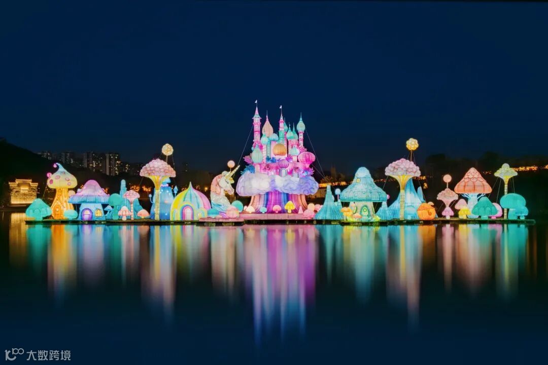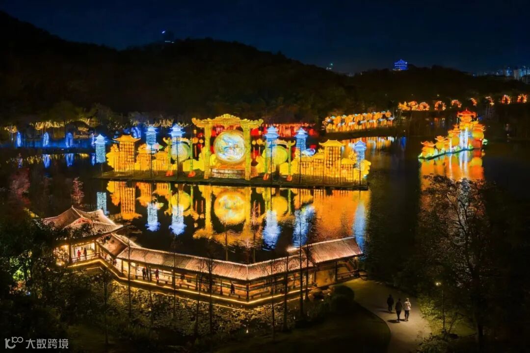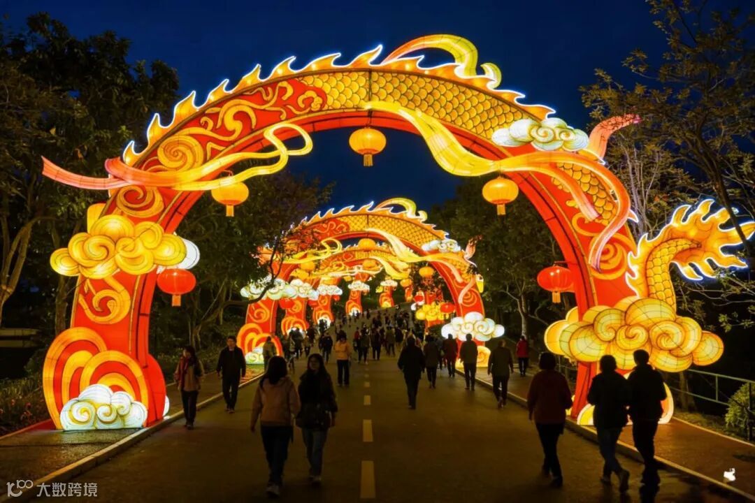 今年灯会位于青秀山东区,布展规模大幅升级,总体占地面积扩展至约1430亩,共展出43组大型灯组,如“财神大道”“龙腾盛世”“双凤和鸣”“光驰八骏”“梦幻城堡”“硕果累累”等主题,并融合声、光、电与壮乡文化元素。还有群众喜爱的“侏罗纪公园”场景,仿真恐龙错落展出,其中霸王龙高达15米,营造沉浸式奇幻体验。