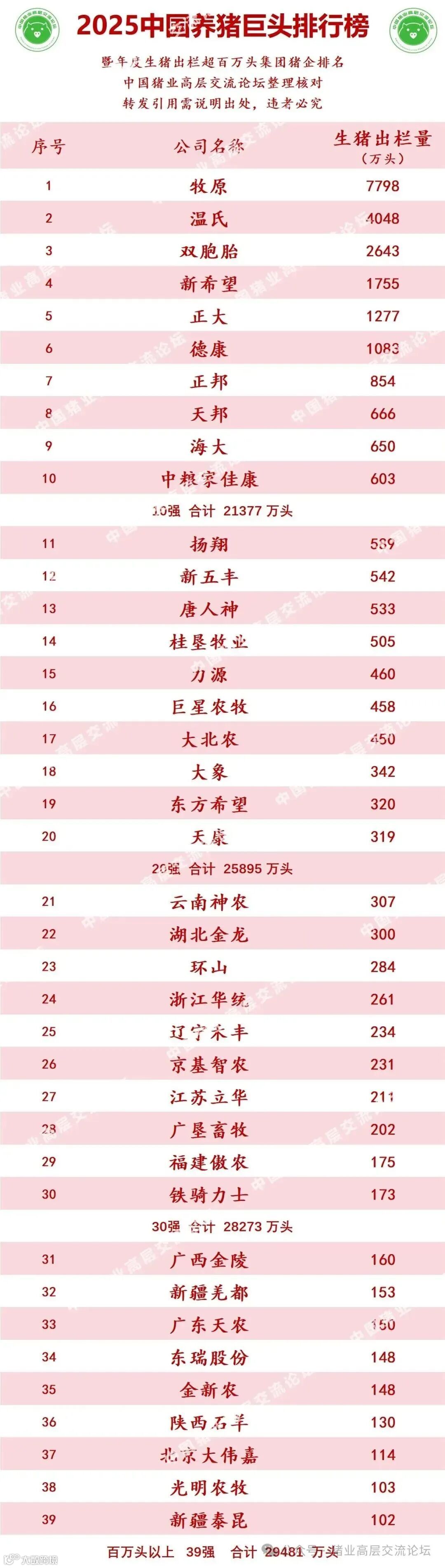 近日,中国猪业高层交流论坛整理发布的2025中国养猪业巨头排行榜正式揭晓,数据显示,2025年全国共有39家猪企跻身 “百万头俱乐部”,较2024年增加7家,合计出栏生猪达2.95亿头,占全国7.2亿头总出栏量的41%,较上年32%的占比大幅提升9个百分点,行业规模化、集中化进程持续加速。
