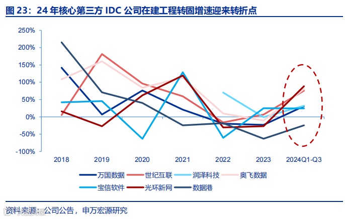 润泽科技:高效成长的IDC新晋领军企业。自2009年成立以来,公司专注于建设大规模园区级数据中心,布局从河北廊坊逐步扩展至长三角、大湾区等核心区域,构建“全国一体化算力中心体系”。截至2024年6月,已投产机柜约7.6万架,规划智算中心61栋、机柜总量达32万架,成长潜力显著。2018-2023年营收复合增长率达47.25%,2024年前三季度实现营收64.10亿元,同比增长139.11%,增速远超行业可比公司。依托电价优势、规模效应与高效运维,IDC业务毛利率持续领先。
