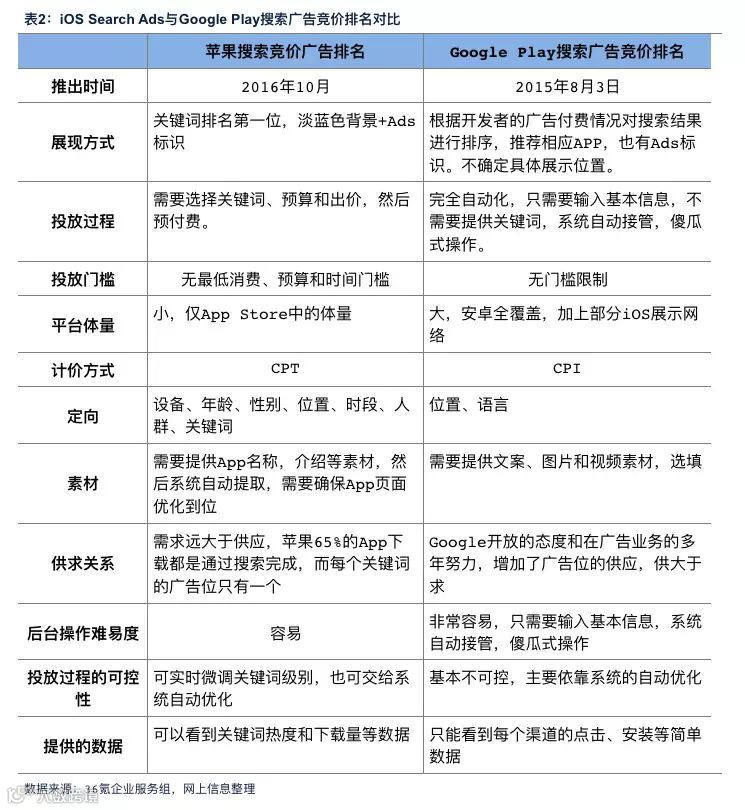 2016年10月,Search Ads率先在美国上线;2017年4月扩展至澳大利亚、新西兰和英国。目前ASM仍处于发展初期,尚无法与成熟的Google AdWords相比。后者通过多年数据积累已实现全自动投放,而iOS Search Ads仍处于手动探索阶段。