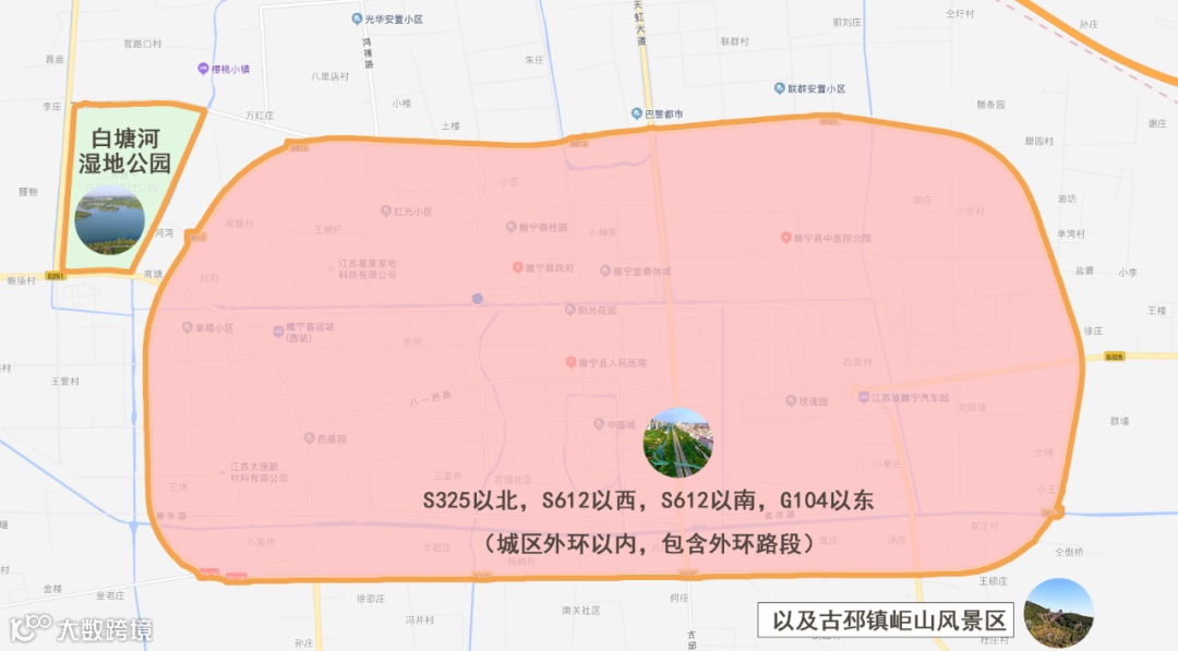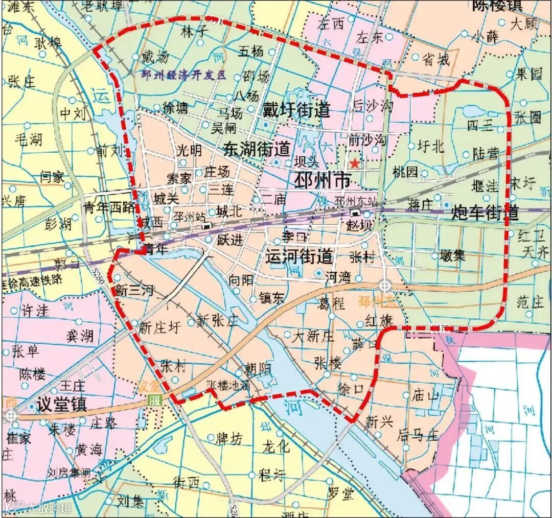 邳州市市区环城南路、环城东路、环城北路、环城西路形成的闭合区域内运河街道、东湖街道、炮车街道、戴圩街道所属区域。